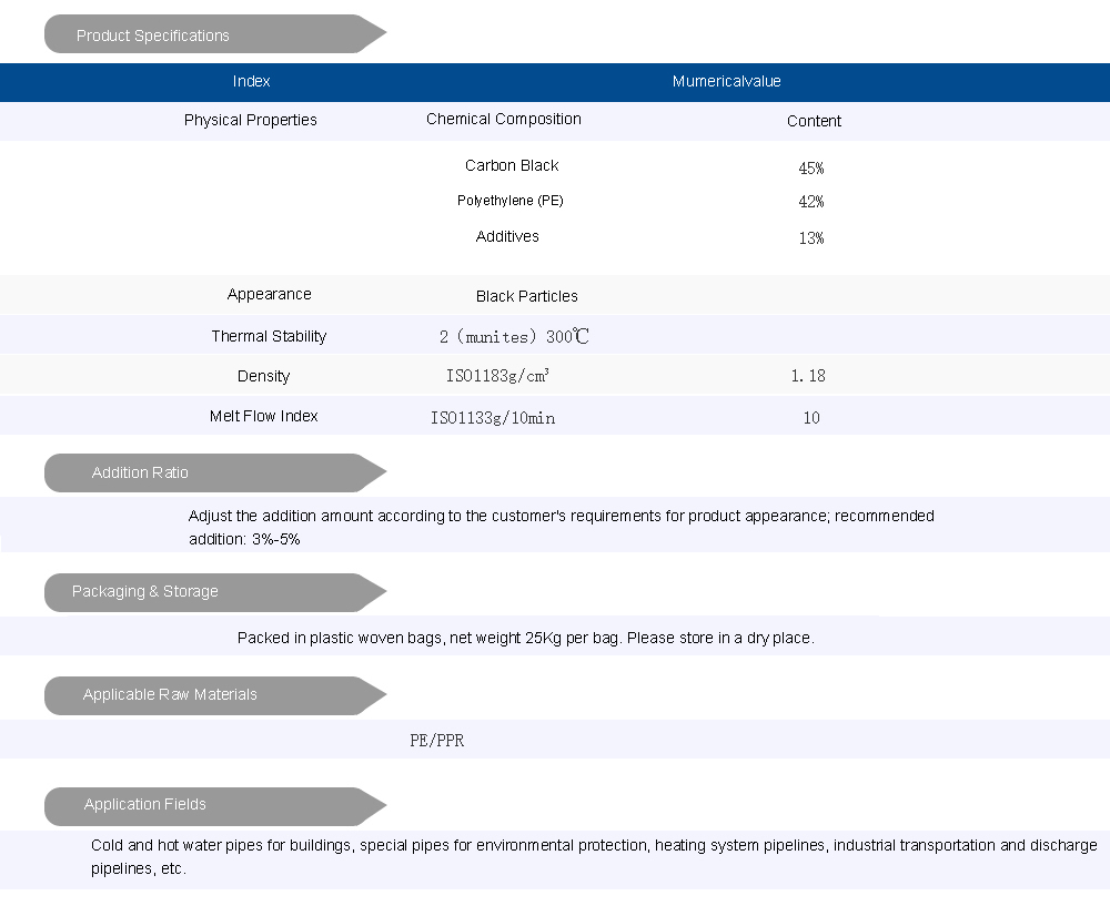 The product delivers uniform, stable color and excellent compatibility with pipe materials without affecting mechanical properties. Its consistent quality ensures reliable performance under demanding conditions, providing a safe and durable coloring solution for various pipe systems.