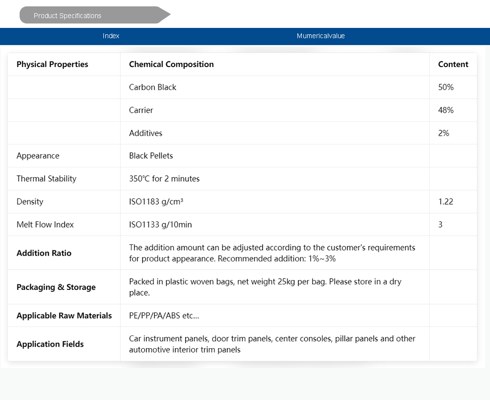The product offers good melt dispersion and color stability, compatible with multiple molding processes, ensuring uniform appearance and maintaining mechanical properties. It is suitable for interior components requiring reliable performance and compliance with automotive environmental standards.
