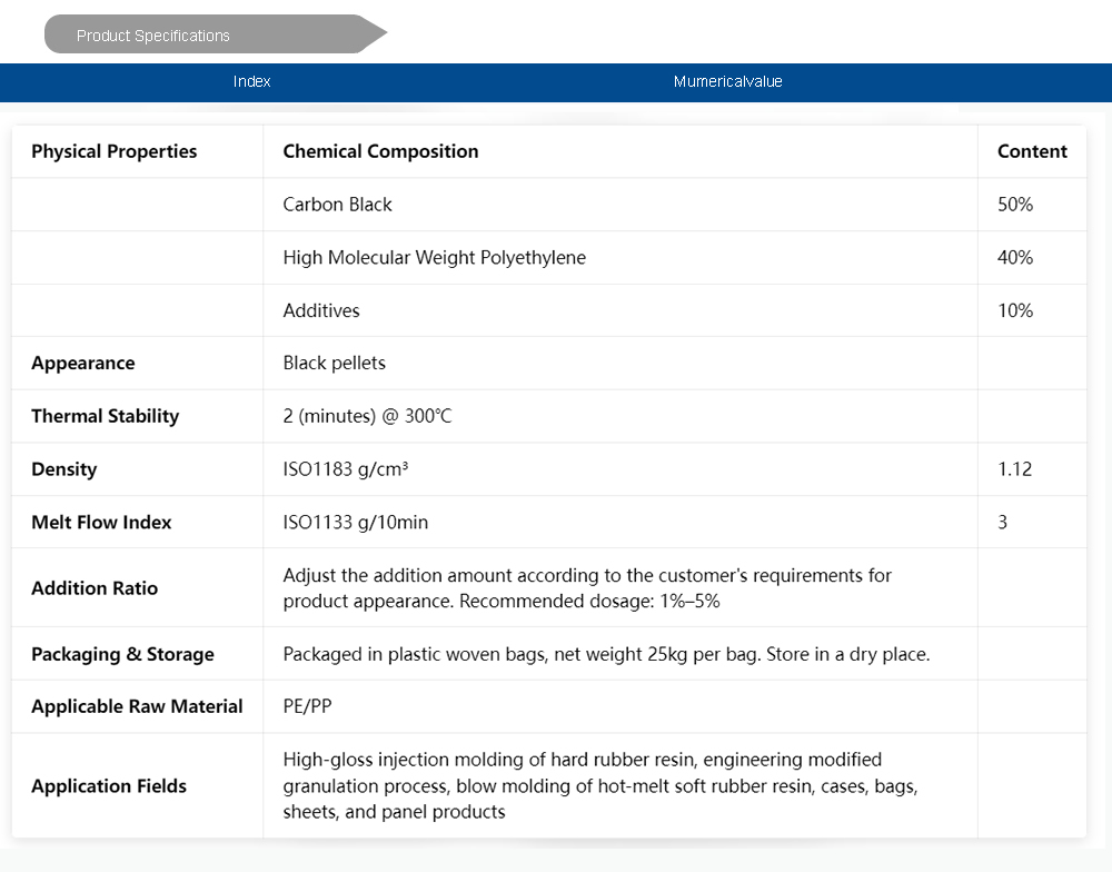 This high-gloss black masterbatch is designed for a wide range of injection molding applications, including household appliances, packaging, sports equipment, toys, and various containers. The flexible formulation allows adjustment of black intensity to meet different product requirements for color consistency and appearance.