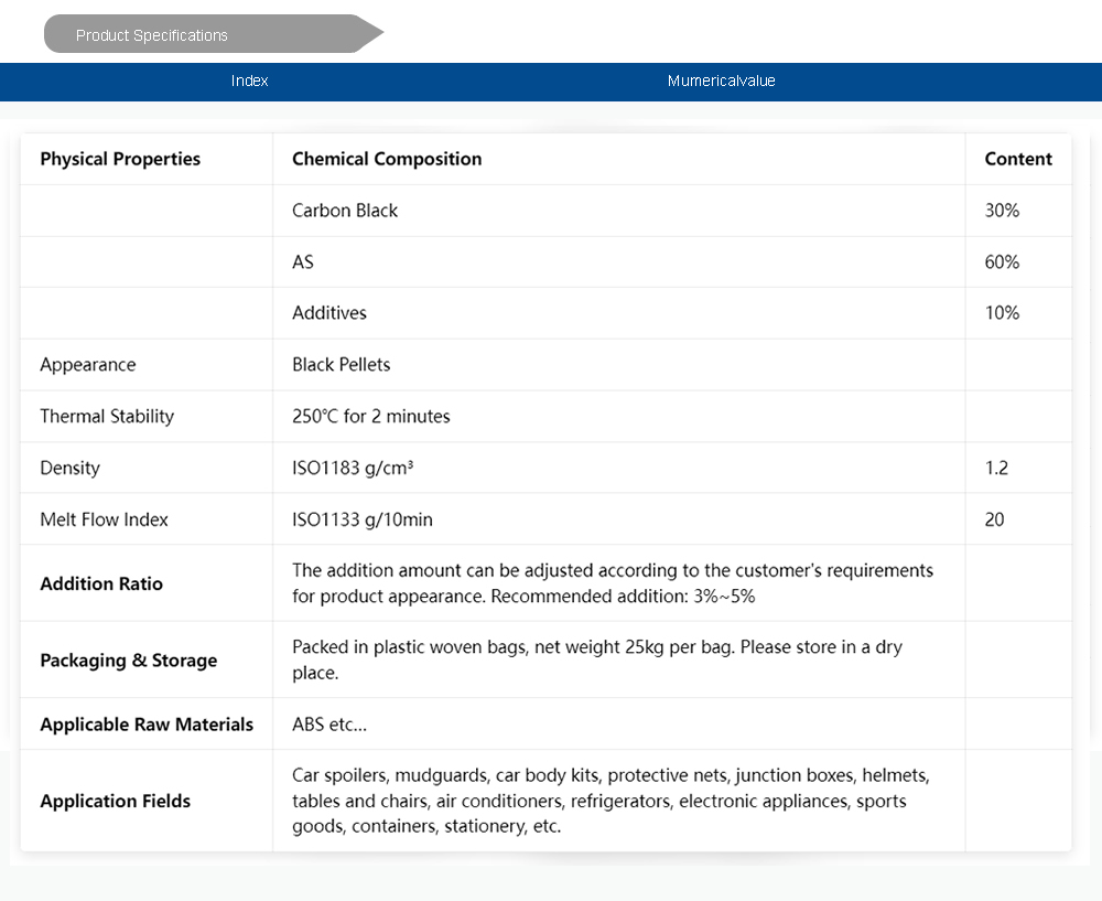 This ABS-specific black masterbatch is optimized for ABS resin, balancing impact resistance, heat and cold stability, chemical resistance, and electrical insulation while maintaining ease of processing, dimensional stability, and surface gloss.