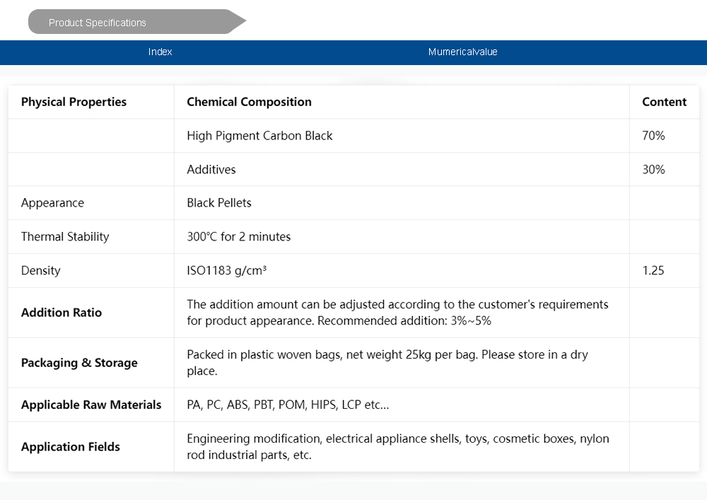 The product delivers deep black color, high gloss, and strong, uniform coloring at low addition levels while preserving the original material properties. It provides a reliable and efficient solution for plastic modification and helps reduce production costs.