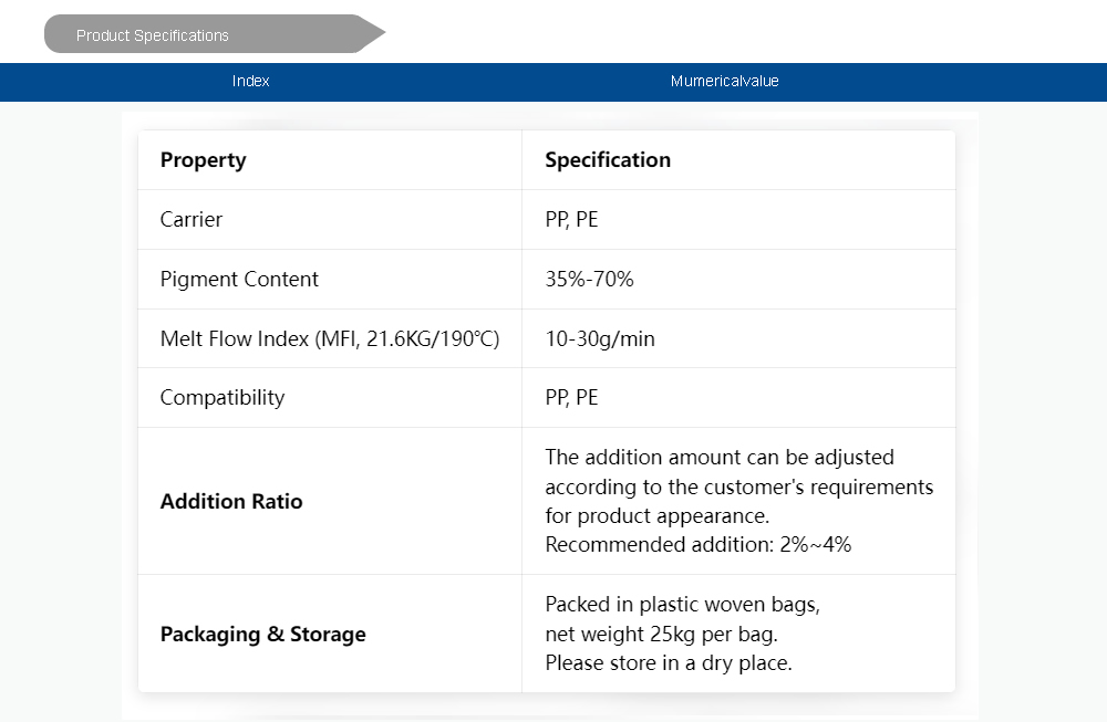 This color masterbatch features bright and vivid colors, high pigmentation, excellent dispersion, and high concentration. It delivers consistent color and strong opacity.