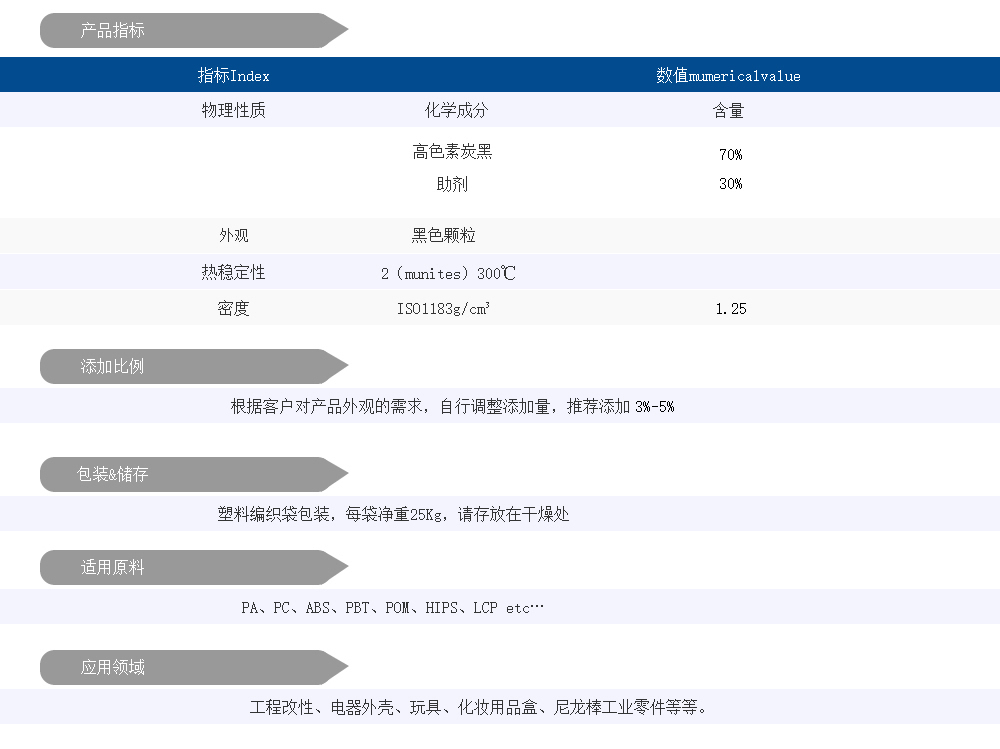 该产品添加量低、黑度纯正、表面光亮,着色力强且均匀稳定,同时保持塑料原有物性,为工程塑料改性提供高效可靠的着色解决方案,并有效降低生产成本。